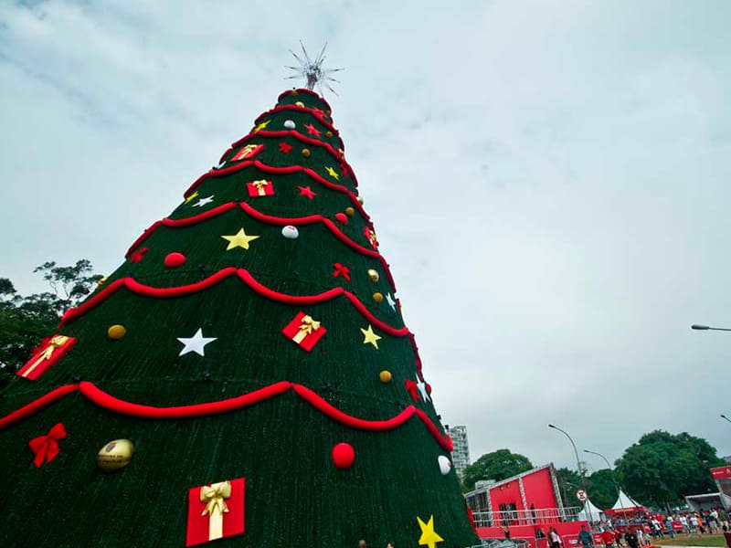 Montagem da estrutura da Árvore de Natal de Ibirapuera com luzes de LED e apresentação.